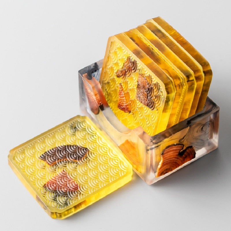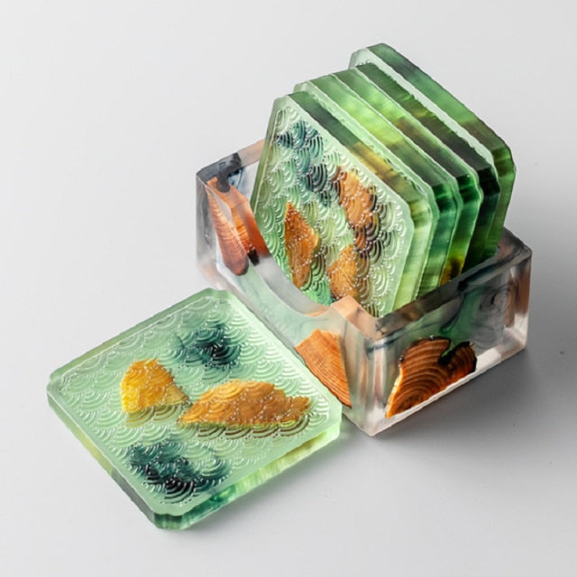 Capture attention with gorgeous resin coasters showcasing wooden treasures inside. Ideal for any color theme or décor style, these lovely coasters work double duty—protecting furniture from condensation rings while adding color and pattern to your home. Use them on a bedside table for a water glass or in the living room when serving cocktails. Each piece is unique with pine chips captured in high-quality embossed colored resin.